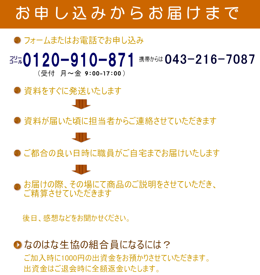 まずはお気軽におためしください なのはな生協配達エリア内の方に限ります とりあえず資料だけという方には なのはな生協配達エリア内の方に限ります お申し込みフォーム 《なのはな生協》 ご希望を選択ください(必須) 選択してくださいこだわり実感1000円セット資料請求(めんつゆプレゼント)資料請求(郵送のみ) お名前 (必須) カタカナ(必須) メールアドレス (必須) 郵便番号ハイフンなし(必須) ご住所(必須) お電話番号(必須) なにかございましたらどうぞ 内容をご確認の上チェックを入れてください ※入力いただいた個人情報は、なのはな生協からのご連絡、ご説明、資料お届けのために利用させていただきます。 知り得た個人情報は、なのはな生協個人情報保護方針に基づき、責任を持って管理いたします。 なのはな生協概要 | 個人情報保護方針 | 利用規約 Copyright (C) 2026 なのはな生協 All Rights Reserved.